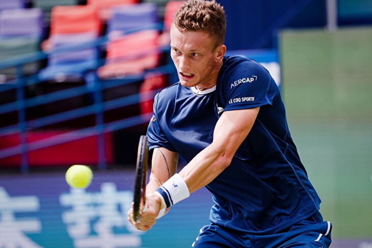 V úvodu druhé sady musel Lehečka odvracet dva brejkboly a i v další hře na podání si situaci zkomplikoval a musel přes shodu. Rinderknech v zápase naprosto skvěle podával a českého hráče k ničemu nepustil. Ve druhém setu vyhrál na servisu patnáct výměn v řadě. Druhý set nakonec musel rozhodnout tie-break.