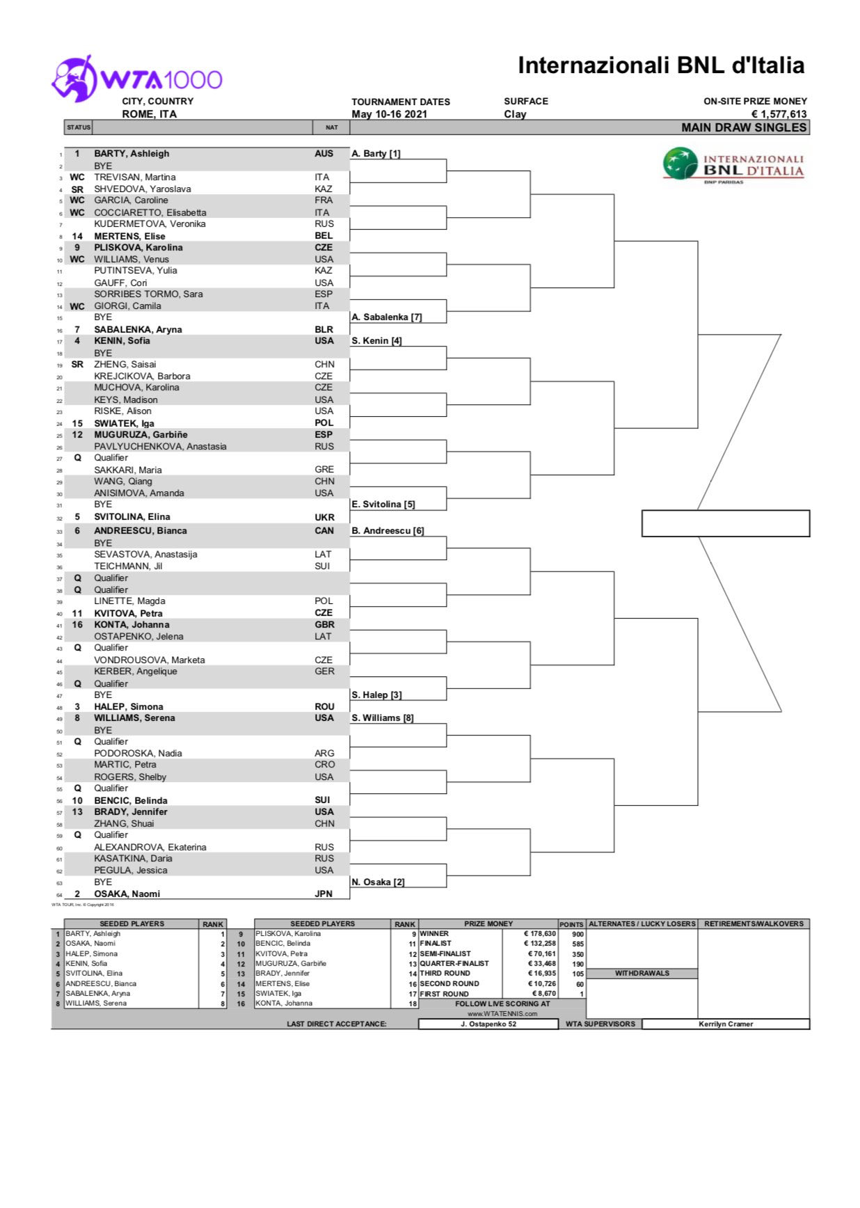 Loňská finalistka a předloňská šampionka Karolína Plíšková vstoupí do antukového turnaje WTA 1000 v Římě proti Anastasiji Sevastovové (h2h 2-2). Lotyška si v prvním kole poradila 3-6 6-1 6-3 se Švýcarkou Jil Teichmannovou.