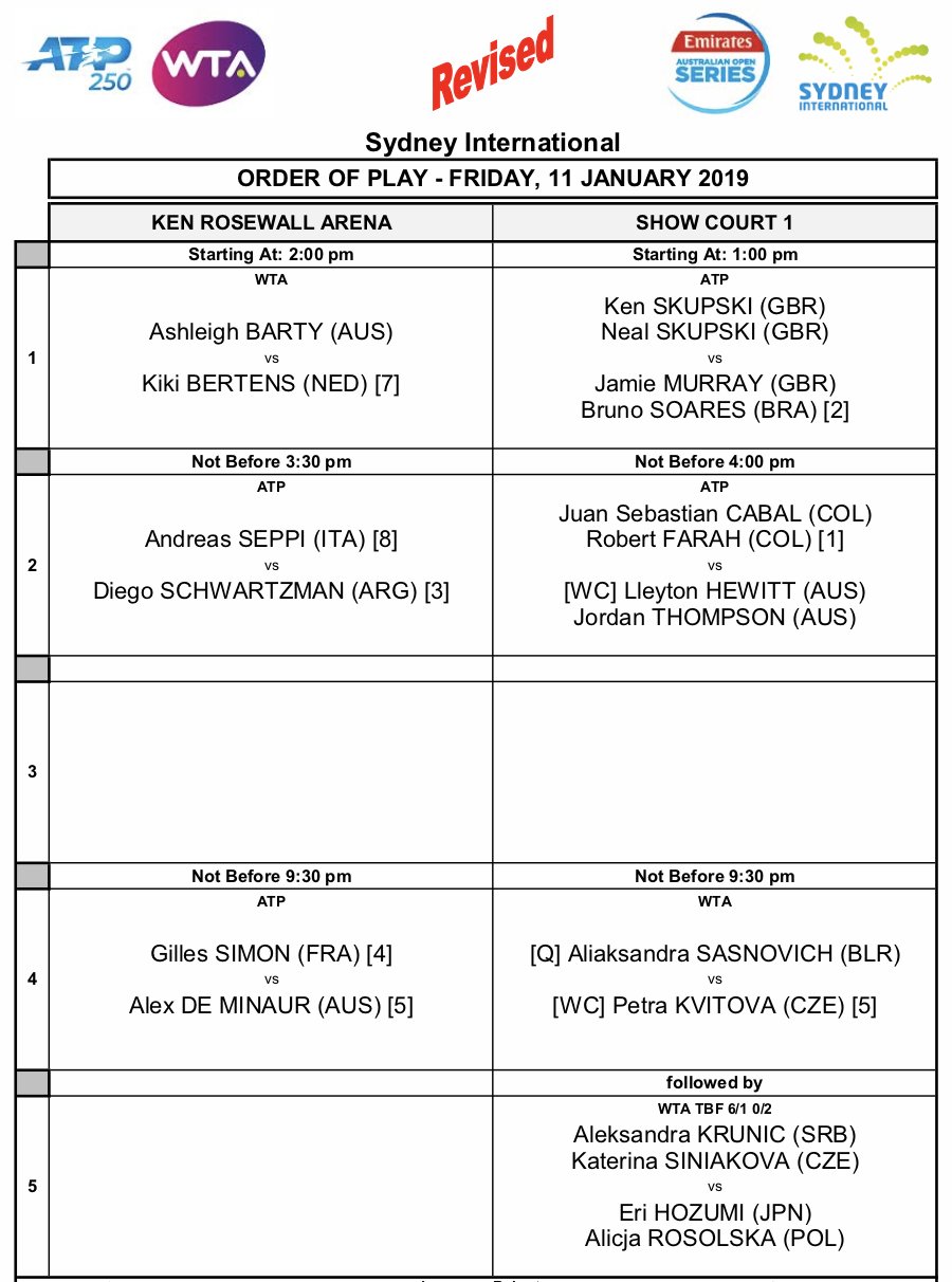 Ani dnešní program na turnaji v Sydney se nakonec neobejde bez komplikací. Těsně po skončení úvodního semifinále dvouhry mužů se nad kurty přihnala dešťová přeháňka, která přerušila finále ve čtyřhře žen. V něm o titul usiluje česká tenistka Kateřina Siniaková, jež společně se Srbkou Alexandrou Kruničovou hrají s párem Hozumiová/Rosolská 6-1 a 0-2.