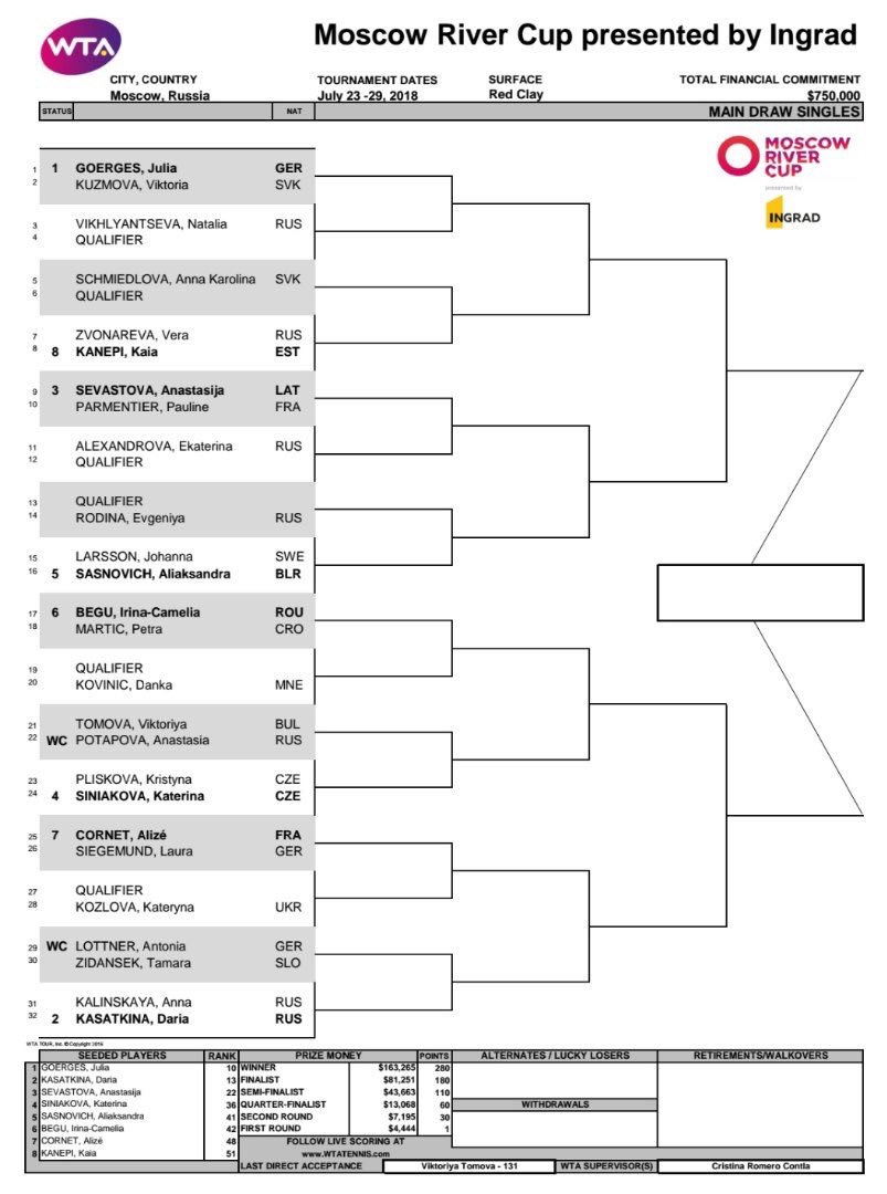 Los nového antukového turnaje WTA International v Moskvě svedl obě české zástupkyně proti sobě už v prvním kole. Čtvrtou nasazenou Kateřinu Siniakovou a Kristýnu Plíškovou čeká už 8. vzájemný souboj, z toho třetí v této sezoně. Nejvýše nasazenými jsou Němka Julia Görgesová, domácí Darja Kasatkinová a čerstvá šampionka z Bukurešti Lotyška Anastasia Sevastovová.