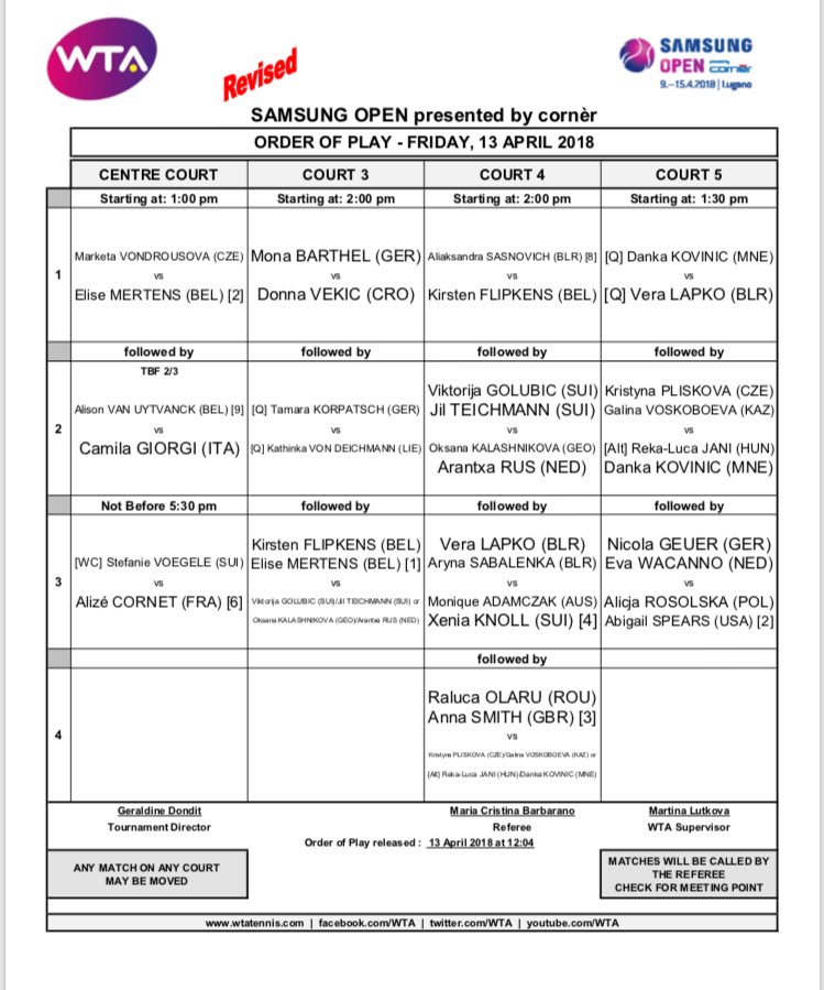 Pořadatele turnaje WTA International ve švýcarském Luganu trápí už od pondělí déšť, a proto se celý dnešní program, dokud se počasí neumoudří, přesouvá do haly. Upravený hrací plán je k dispozici zde.