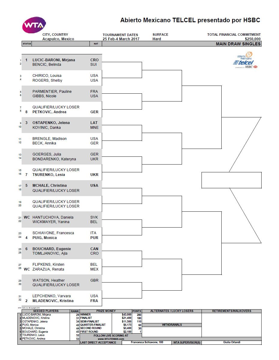 Také souběžně hraný turnaj žen v Acapulku nabízí hned od úvodu zajímavé duely, byť v Mexiku nestartuje žádná hráčka Top 20. Nejvýše nasazená Chorvatka Mirjana Lučičová začne proti Švýcarce Belindě Bencicové (h2h 0-2), ve formě hrající Francouzku Kristinu Mladenovicovou vyzve nevyzpytatelná Američanka Varvara Lepchenková či olympijská vítězka Monica Puigová se utká s bývalou grandslamovou šampionkou Francescou Schiavoneovou.