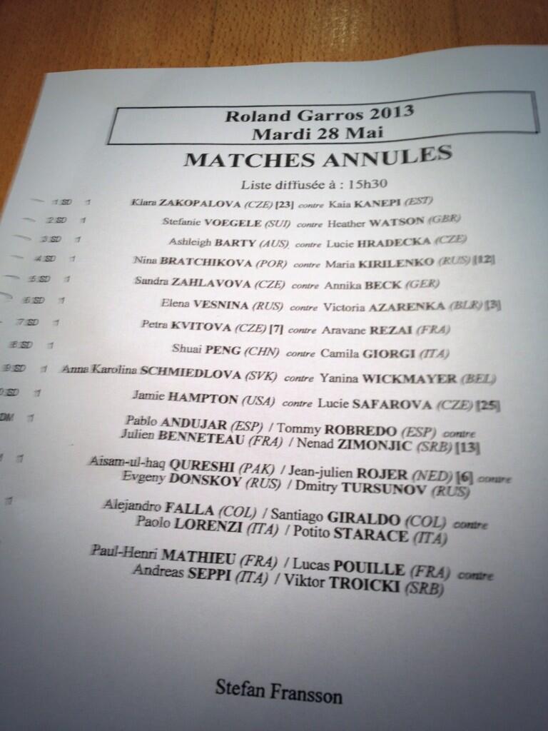 Pětice českých tenistek si na odehrání svého prvního utkání v Paříži musí počkat do zítra. Petra Kvitová, Klára Zakopalová, Lucie Hradecká, Lucie Šafářová i Sandra Záhlavová dnes totiž měly hrát na svých kurtech poslední zápasy, které pořadatelé zrušili. Seznam přesunutých zápasů najdete zde.