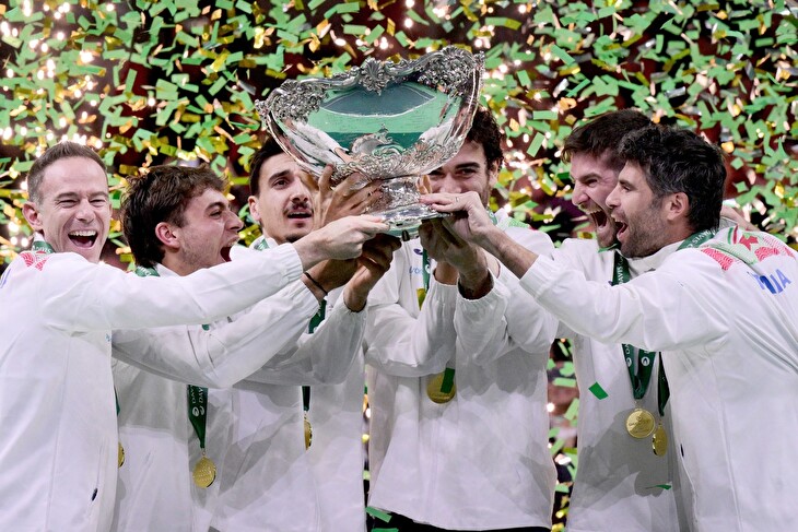 Italský tým slaví zisk třetího daviscupového titulu v řadě (@ Tiziana FABI / AFP / AFP / Profimedia)
