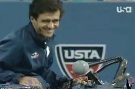 Stačilo pár centimetrů a rozhodčí Carlos Ramos mohl loni na US Open skončit minimálně s pěknou modřinou. Míč z rakety Rafaela Nadala mířil na jeho hlavu, nakonec to ale odnesl jen mikrofon...